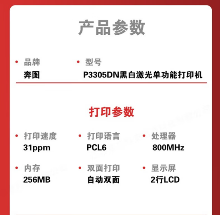 參數(shù) [品牌] 奔圖 [型號] P3305DN [毛重] 7.5KG